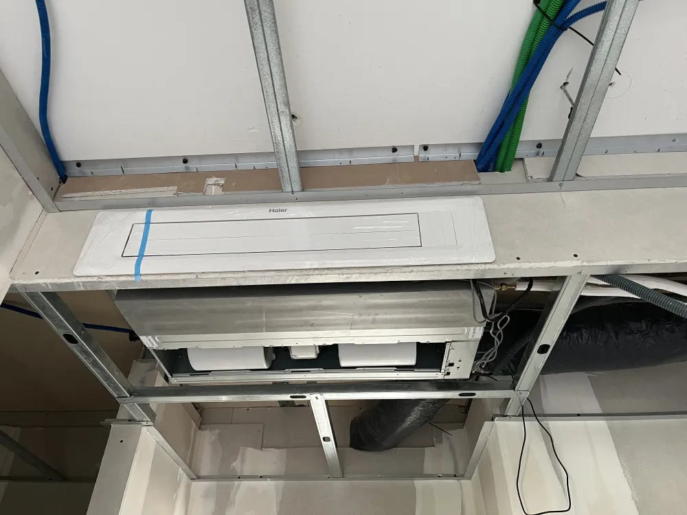 Installation de gainables en faux plafond avec grille de soufflage a volet automatisé et grille de reprise par le dessous.